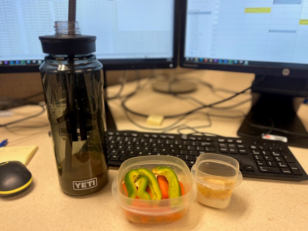I took this image a little over a month ago of my breakfast, feeling pretty good about my veggies and cold brew. Not a lot of calories right there– eating healthy! I’ve spent the past couple of months working on my health. Working out is something that used to be very important to me but when my son came along in 2020, I just didn’t find the time. The last thing I wanted to do was get up earlier than 4am to make it happen before work or hop on the elliptical as soon as I got home and was already concerning myself with what was for dinner and how we were going to go about the bedtime routine that night.